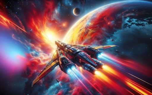 A spaceship soaring through the vastness of space, with its engines blasting powerful streams of light, creating a brilliant effect. Surrounding it is a sky filled with stars and planets in vibrant colors like orange, red, and blue, forming a mysterious and dramatic scene. The spaceship, with its strong and modern design, is heading into an endless space, evoking a sense of exploration and promising space voyages.
