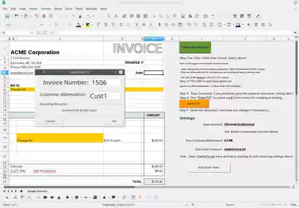 Push the green button: Fills in next invoice number automatically ( you can enter a new starting point ) Fills in date Generates a filename similar to:  Invoice1234-ACME-Cust.